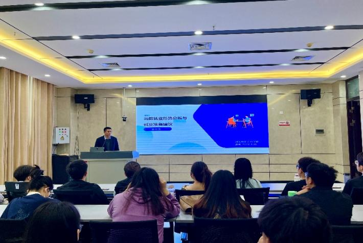 李红见首先就河南省高校毕业生就业情况向同学们作基本分析,并引用大量数据表格,使同学们对当前就业情况有了较为清晰、直观的认识。他指出当前毕业生就业形势较为严峻,主要表现为以下两个方面:一是供给多方叠加、总量短期大增;二是求“稳”“缓就业、慢就业”现象突出。面对异常严峻的就业形势,他表示充分利用各种平台的信息和资源,掌握就业信息、洞悉社会就业环境是破局的关键。
