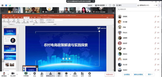 徐延军以“农村电商政策解读与实践探索”为题,介绍了我国农村电商发展的背景和现状,并对2005年至今国家围绕农村电商发展的政策进行了解读,最后以光山县、镇平县等为例详细说明了电商如何赋能乡村振兴和农业农村发展。