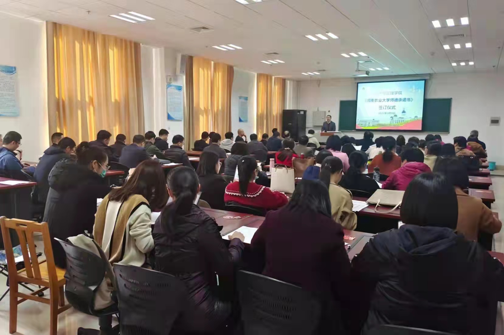 在繁塔楼B208举行了2022年度《河南农业大学师德承诺书》签订仪式。学院领导班子及全体教职工参与了本次活动。