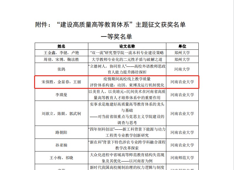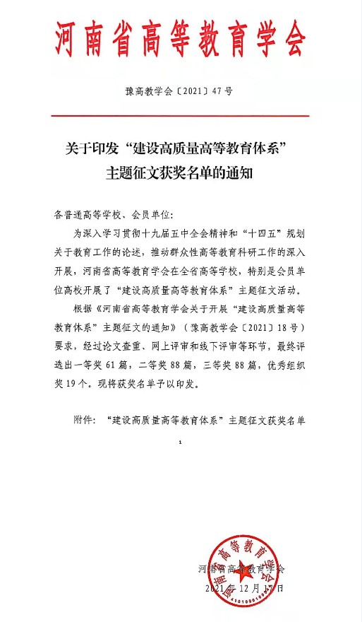 日前,河南省高等教育学会发布了《关于印发“建设高质量高等教育体系”主题征文获奖名单的通知》,经论文查重、网上评审和线下评审等环节,最终评选出一等奖61篇,二等奖88篇,三等奖88篇。台湾av女优
