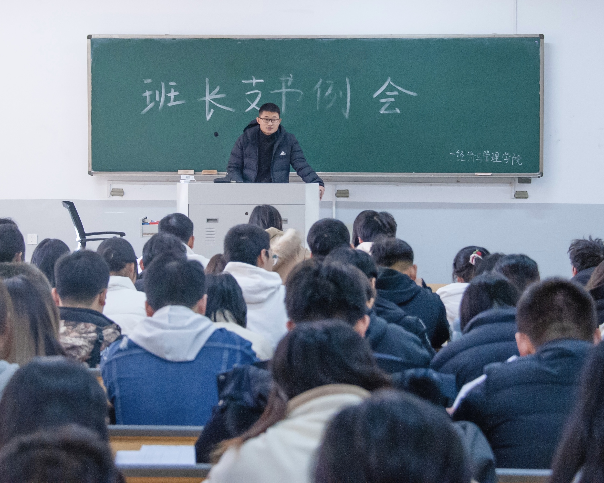于教学楼D106召开第十三周班长支书例会。团委老师余月圆、张桂玲、戚亚薇到场出席,19、20、21级班长支书积极到场参加。
