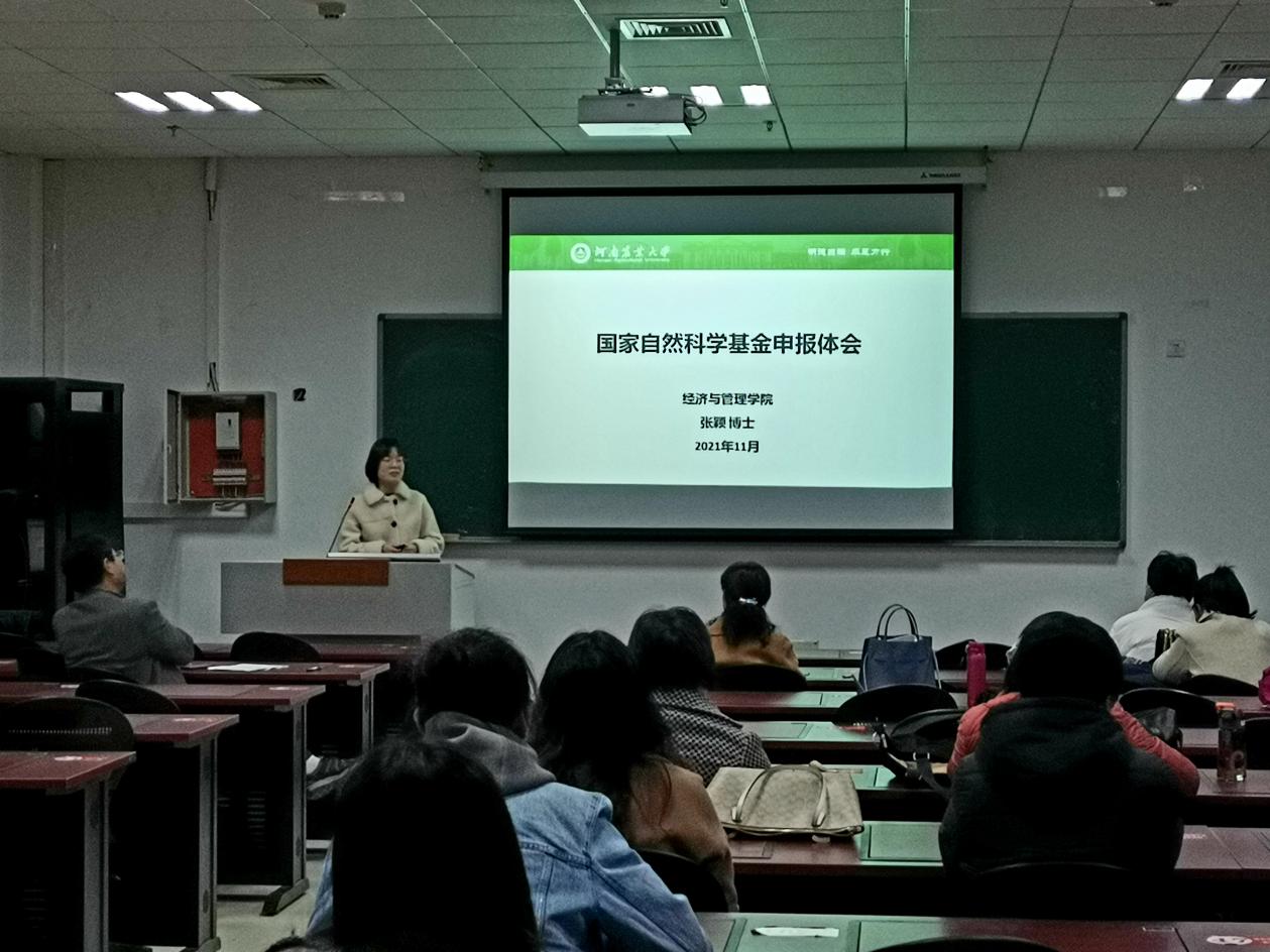 张颖从自身基金申报经历与心得体会出发,向在座师生详细讲解了自己在基金申报过程中遇到的困惑,多次参与学院基金论证的收获以及国家自然科学基金申报书形式与审查工作要点。