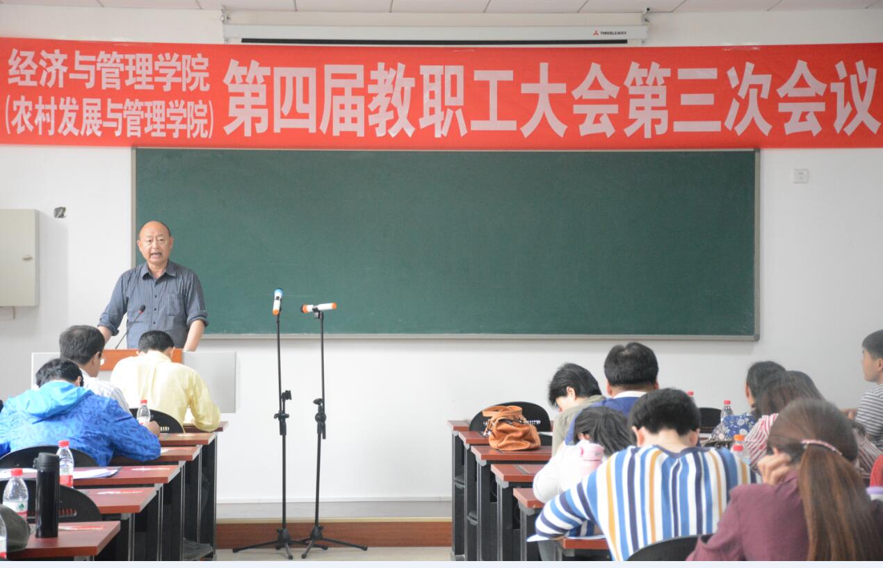 (农村发展与管理学院)第四届教职工大会第三次会议在繁塔楼B208召开,学院领导班子及全体教职工参加了本次会议,会议由院党委副书记、院分工会主席李建群主持。