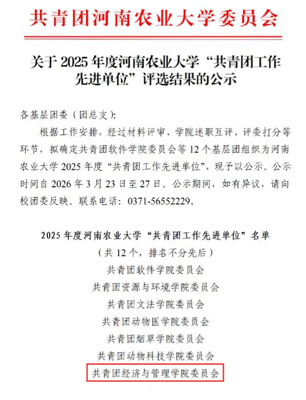共青团委员会立足学科强项,做实思政教育,凭借过硬的成果、富有辨识度的专业特色与成熟的育人机制脱颖而出,成功获评2025年度河南农业大学共青团工作先进单位!