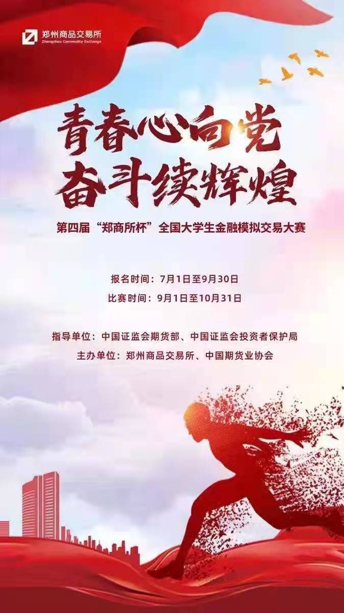尊敬的河南农业大学学生朋友们,郑州商品交易所为深入贯彻落实党的十九大和第五次全国金融工作会议精神,落实证监会与教育部联合发布的《关于加强证券期货知识普及教育的合作备忘录》部署,做好期货知识普及工作,适应新形势下期货市场发展对人才的需求,在证监会期货部、投保局指导下,我所联合中国期货业协会将于近期举办第四届“郑商所杯”全国大学生金融模拟交易大赛活动。经过我公司积极申请,郑州商品交易所已对我公司资格、资质予以审批通过,东兴期货有限公司获得承办开展我校金融模拟交易大赛的报名辅导工作,以及后续进行“期货知识知识进校园”活动资格,现将有关事项通知如下。